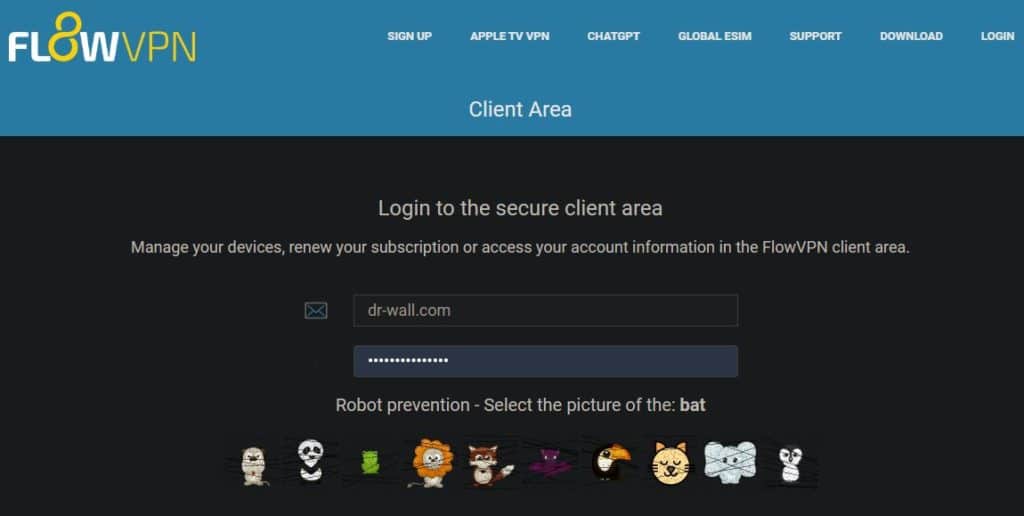 - Log in to FlowVPN client area (flowvpn.com/client).