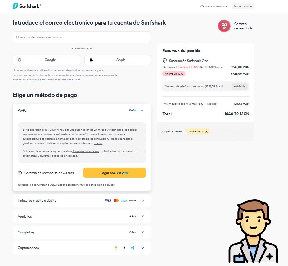 Selecciona el plan de SurfShark que deseas y proporciona un correo electrónico válido para activar tu cuenta.